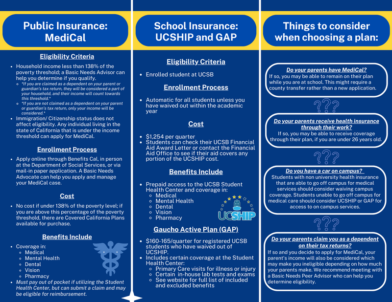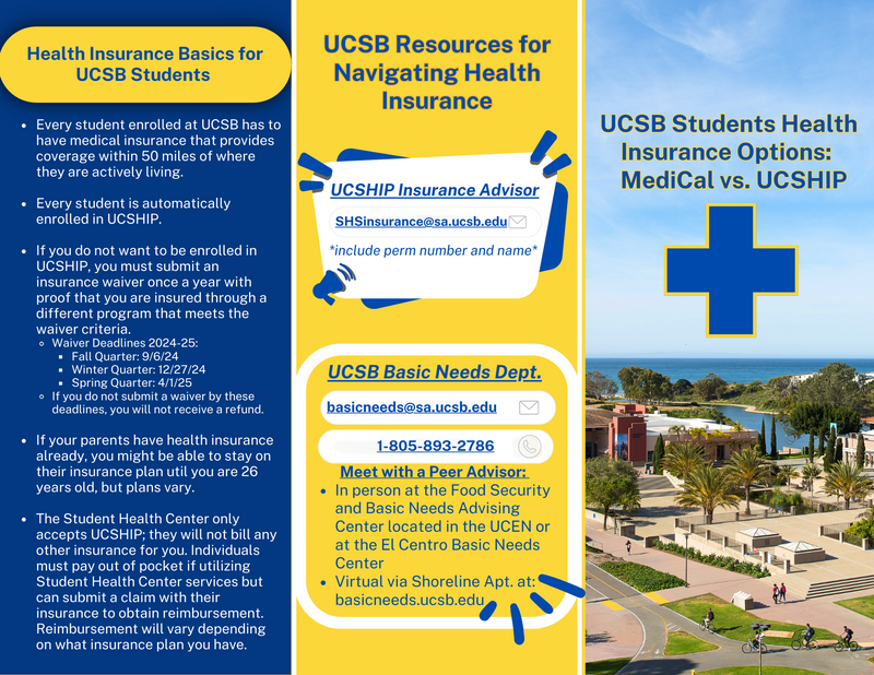 The pamphlet covers the essentials of health insurance, details about MediCal and UCSHIP, and application guidelines. It also provides additional resources available at UCSB to assist students in making informed decisions. This pamphlet has been distributed throughout the UCSB campus and is a valuable reference tool for students. Its primary objective is to bridge the education gap that young adults face regarding health insurance literacy.